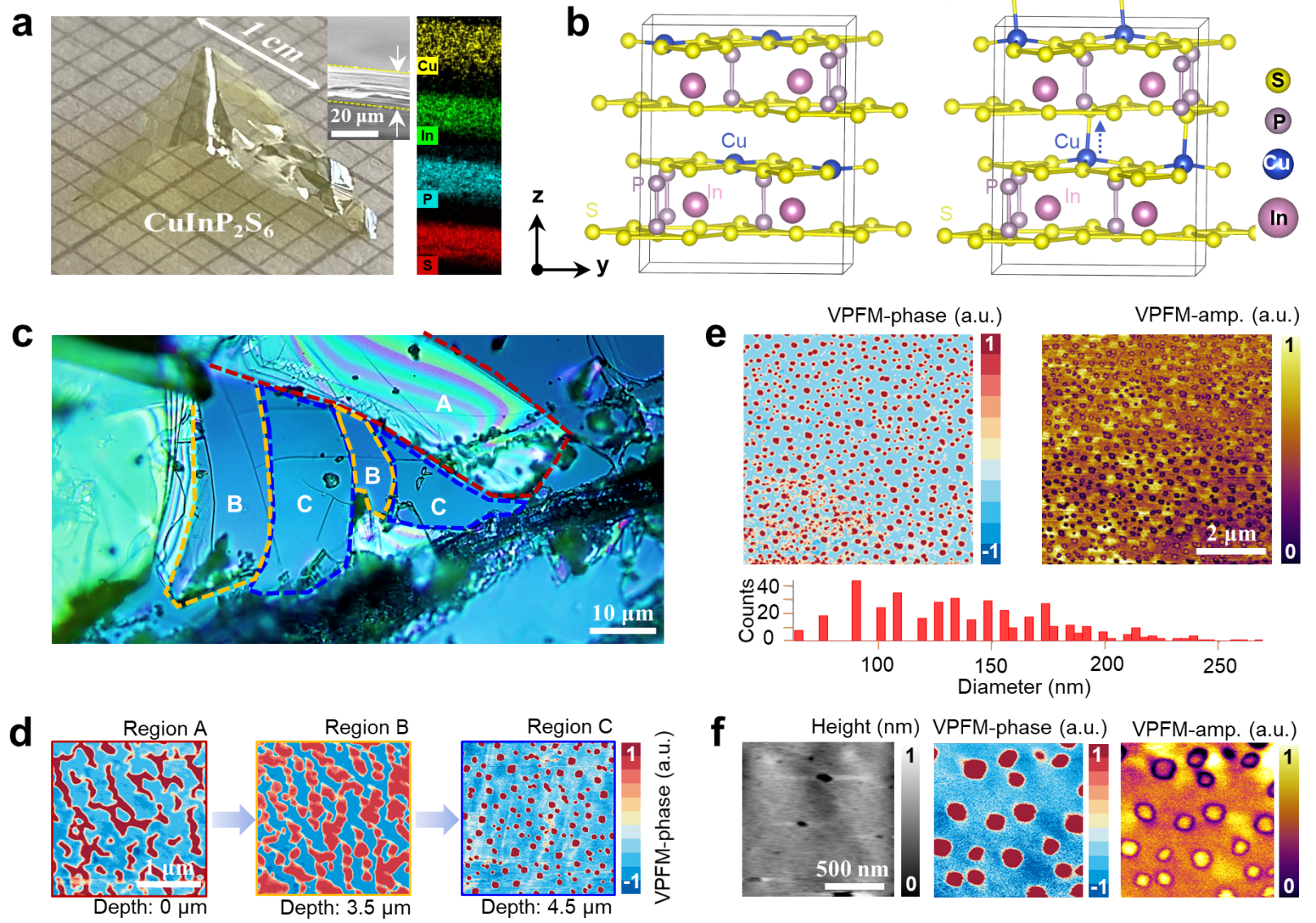 范德瓦尔斯材料因其层间弱相互作用、无悬挂键表面和优异的力学柔性等优点,为构筑可转移、可集成的功能器件提供了理想材料体系。特别是具有离子迁移特性的铁电性范德瓦尔斯材料CuInP2S6(CIPS),其展现出了多稳态结构、离子电导、负压电性等独特的物理特性,尤其是其极化共存旋转的特点,为构筑极性拓扑结构提供了可能。
