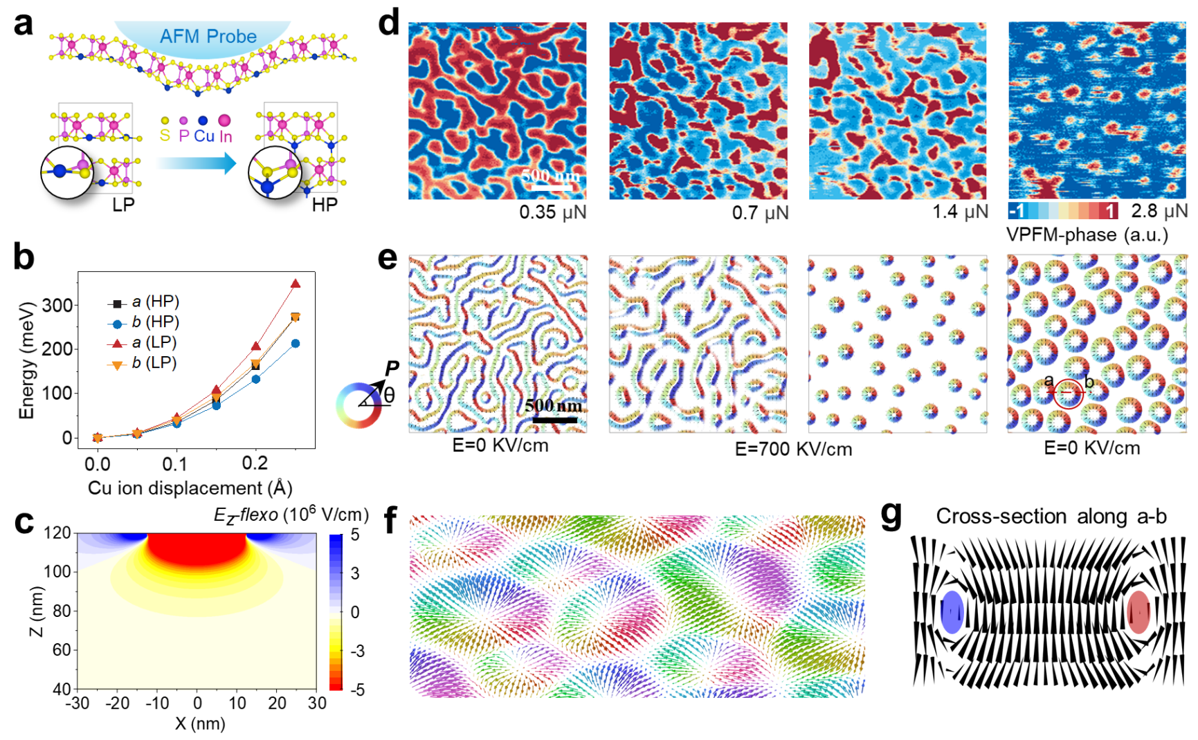 1.压缩应变促使Cu离子迁移至范德华隙,实现由LP到HP相的转变;而应变梯度则通过挠曲电效应产生强局域电场(可达106 V/cm),共同驱动迷宫畴向气泡畴演变。